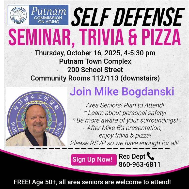 Senior Self-Defense, Trivia, Pizza with Mike Bogdanski, Thursday, October 16, 4-5:30pm, FREE