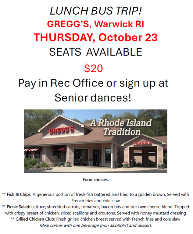 Senior Lunch Trip to Greggs in Warwick, Thurs Oct 23, $20, pay in Rec Office